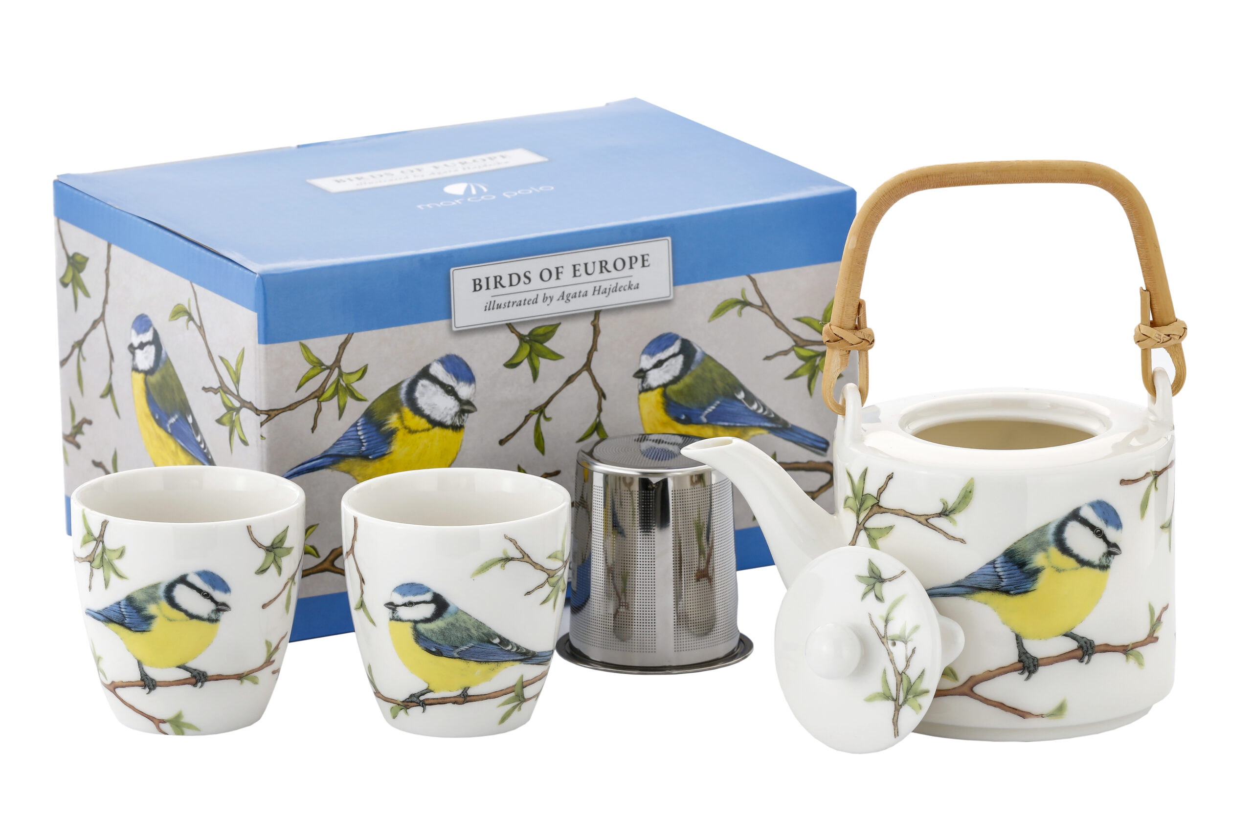 600 ml tējkanna ar sietiņu un 2 krūzes.